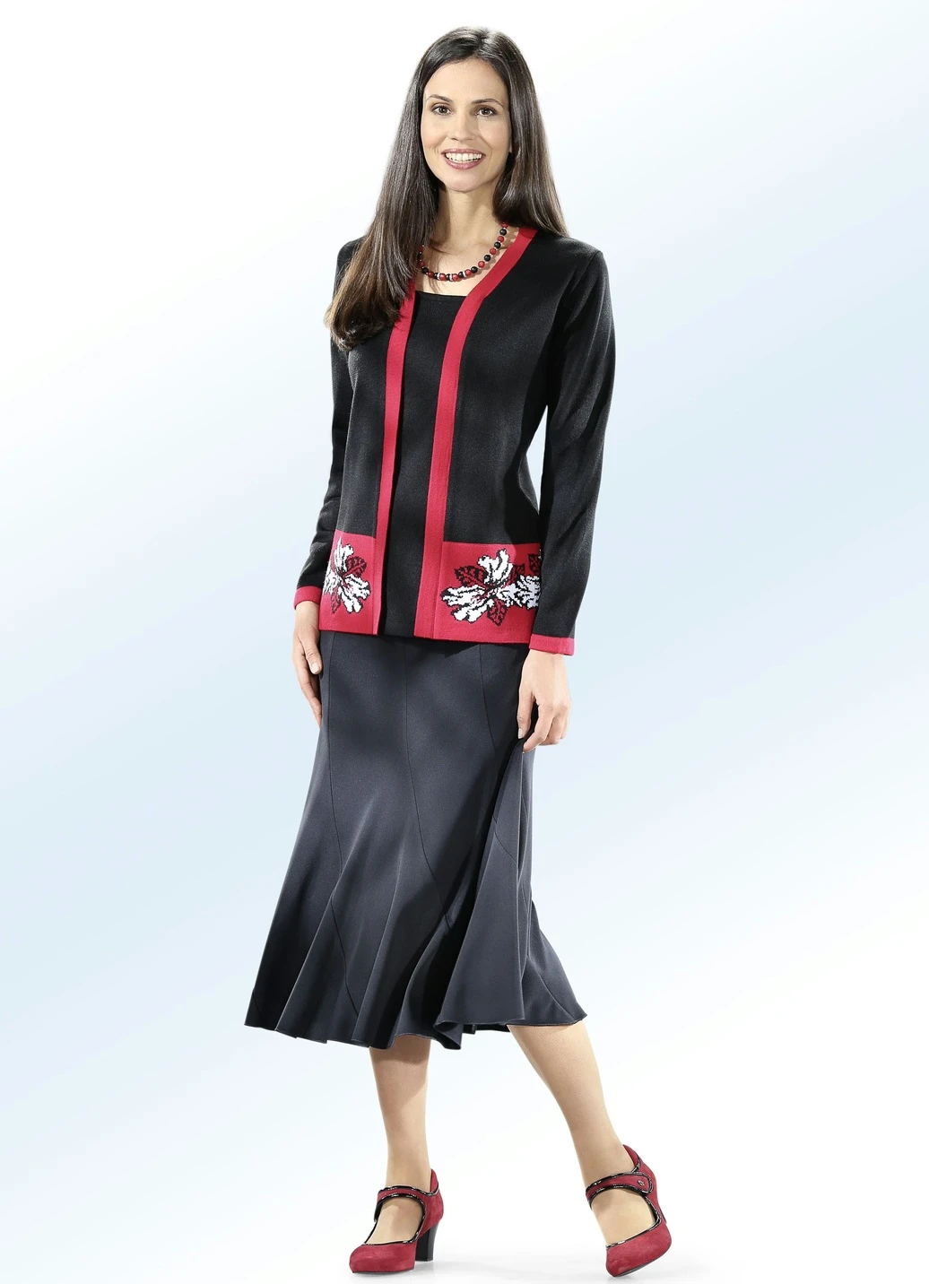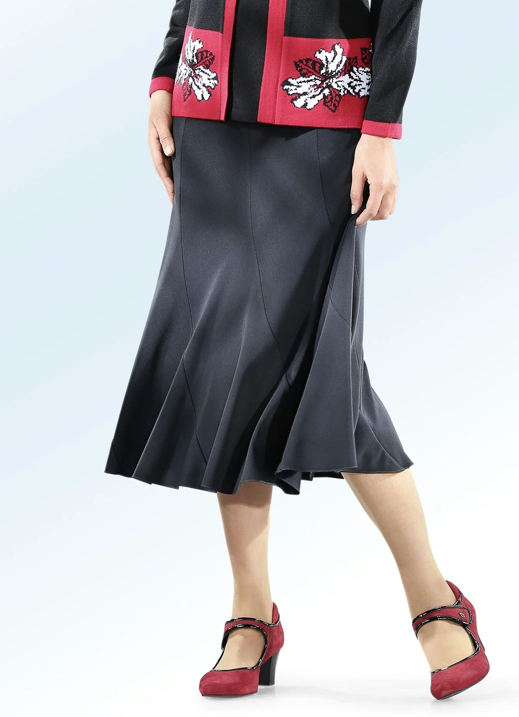 Wunderschön fallender, schwarzer 8-Bahnenrock in bequemer Schlupfform, mit schmalem Dehnbund rundum sowie bogenförmig verlaufenden Bahnen, die für eine schwingende Weite am Saumabschluss sorgen. Länge ab Taille ca. 75 cm, bei K-Gr. ca. 71 cm.