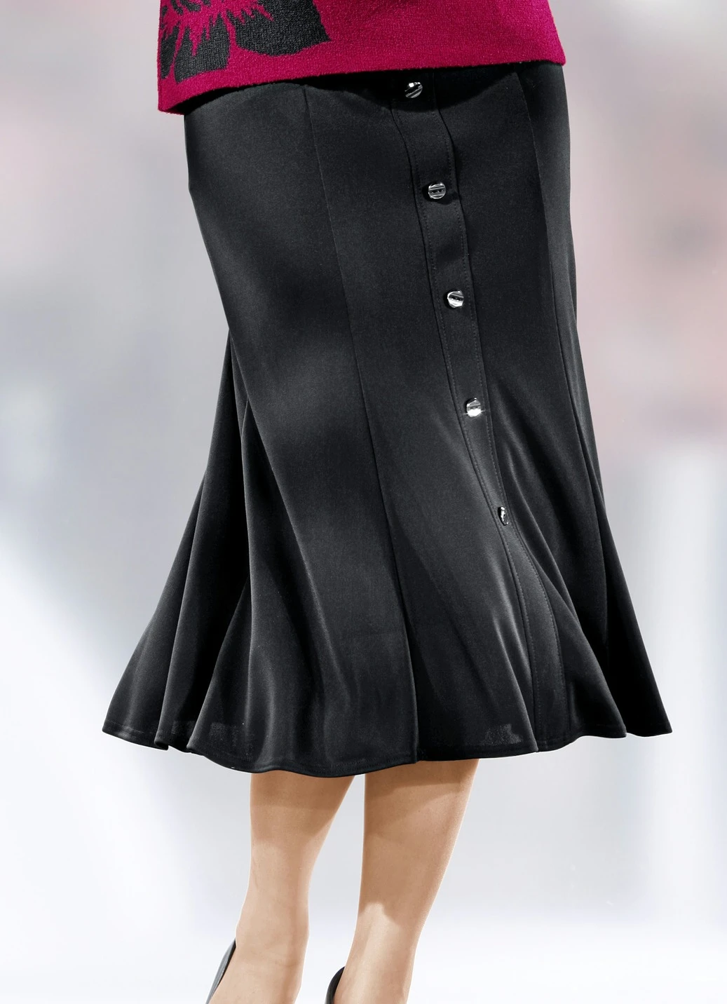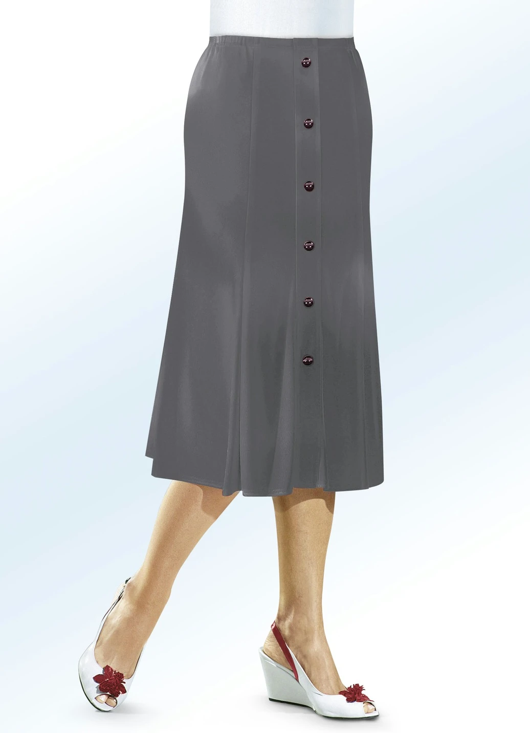 Exzellenter, weich fließender, langer 6-Bahnenrock: leicht ausgestellte, Figur umspielende Form, bequeme Schlupfform, schmaler Dehnbund rundum sowie schmückende Zierknopfblende im Vorderteil. Länge ab Taille ca. 72 cm, bei K-Gr. ca. 68 cm.