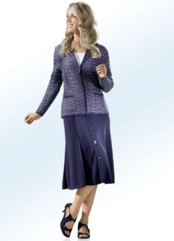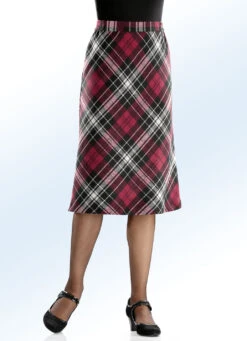 Edel schimmernder, figurumschmeichelnder 6-Bahnenrock in bequemer Schlupfform, mit Dehnbund rundum sowie nach unten hin glockig schwingendem Saum durch die modische Godet-Form. Länge ab Taille ca. 74 cm, bei K-Gr. ca. 70 cm.