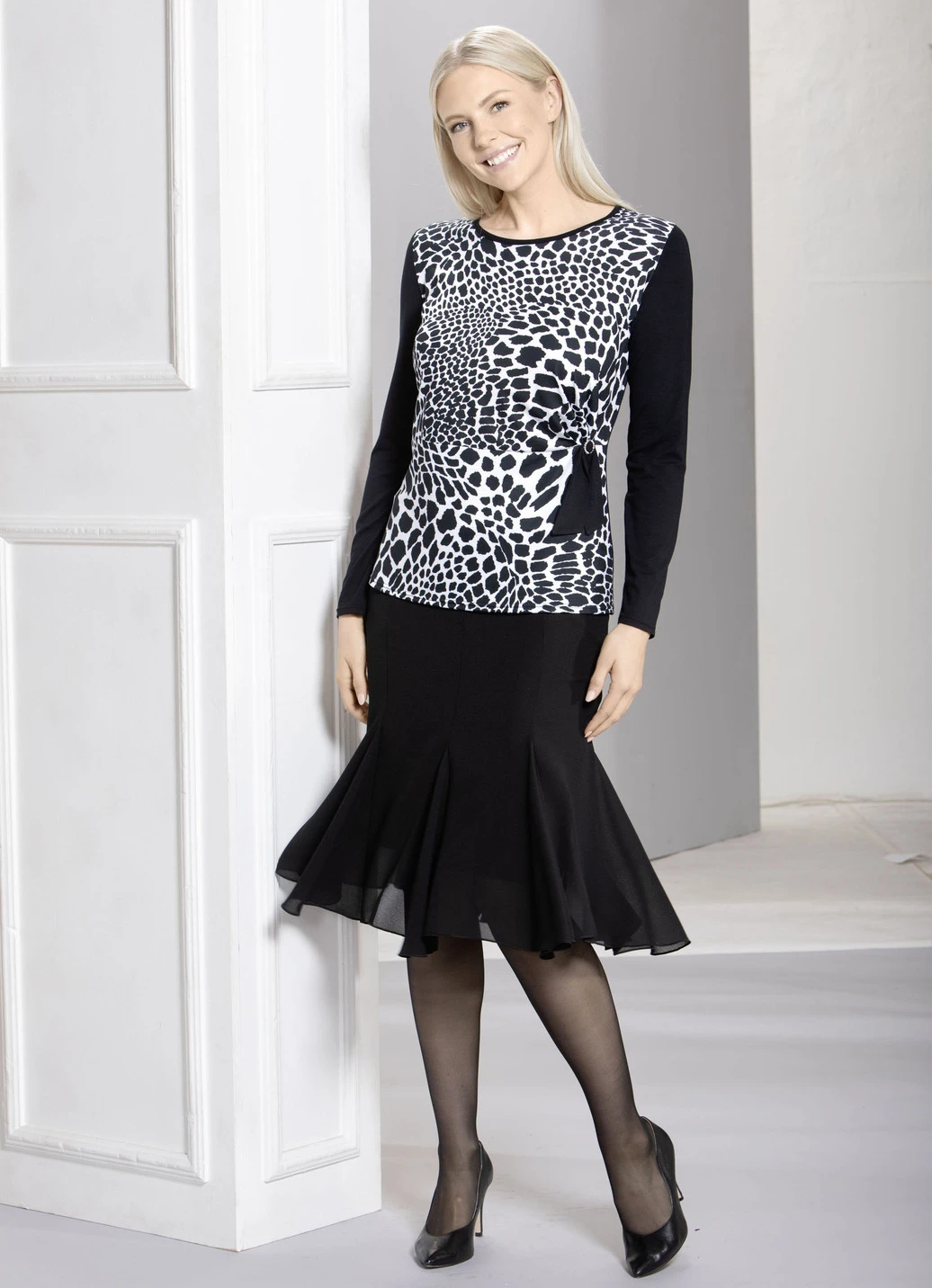 Extravagantes Shirt mit Teilungsnaht, Schmuckring und Schleife im schwarz-weiß dessinierten Vorderteil sowie Ärmeln und Rückteil in Schwarz.
