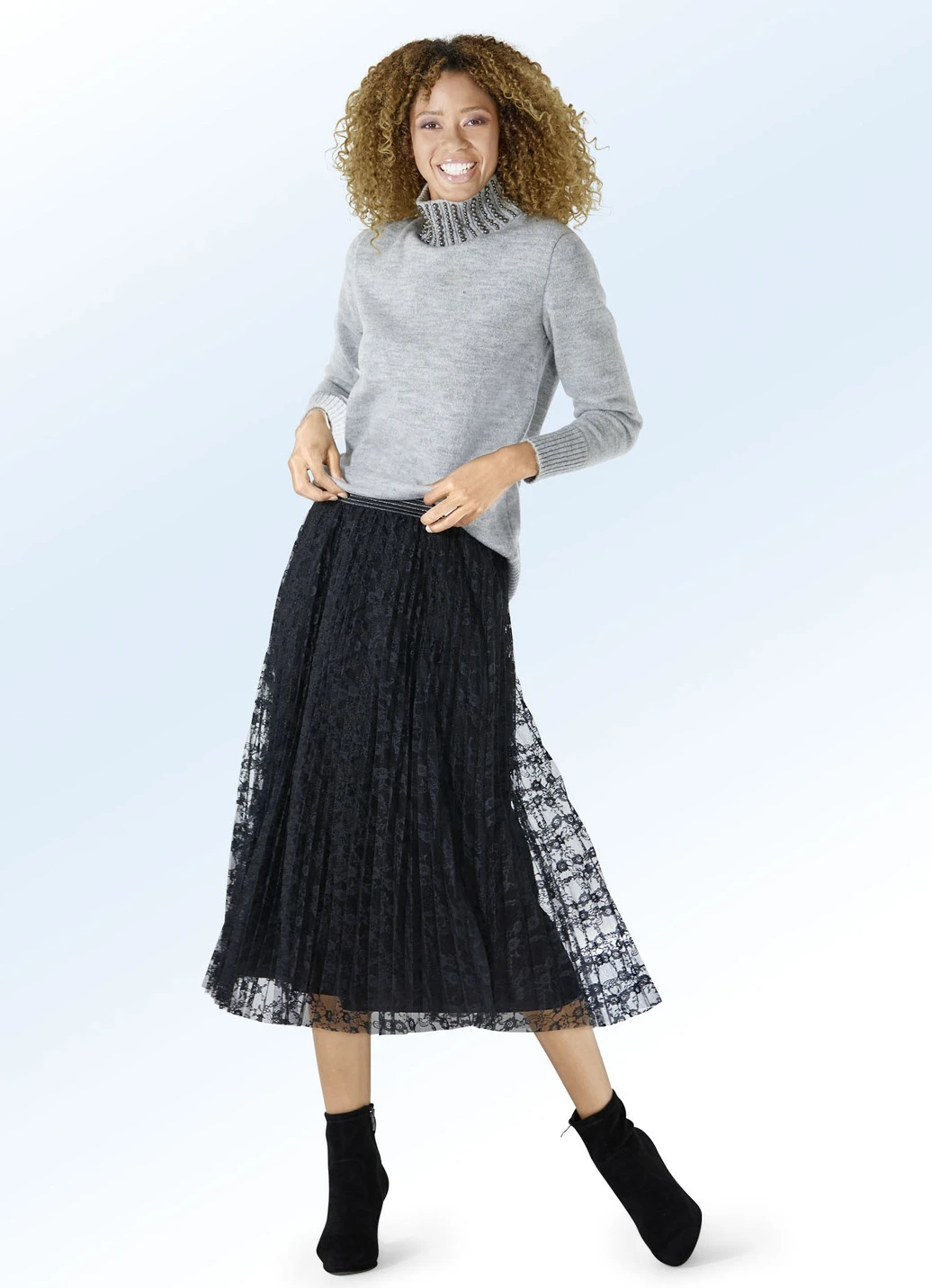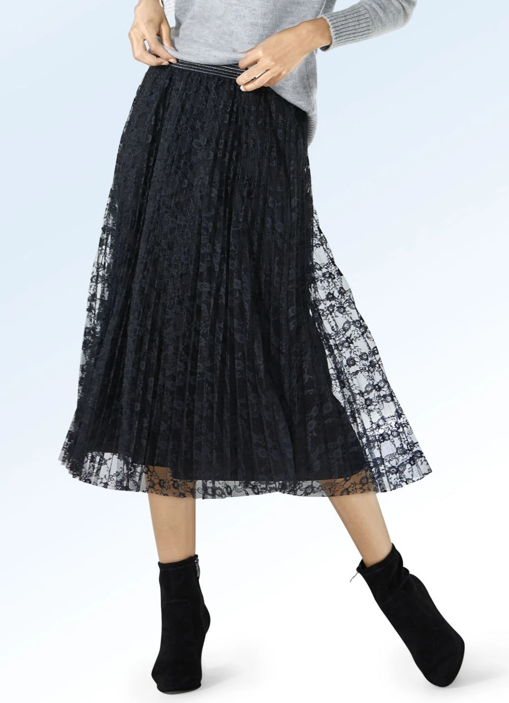 Exzellenter, schwarzer Plissee-Rock in Schlupfform, mit formstabilem Dehnbund rundum sowie effektvollem, silberfarbenem Glanzgarn. Blickdicht unterlegt mit dezent schimmerndem Jersey. Länge ab Taille ca. 75 cm.
