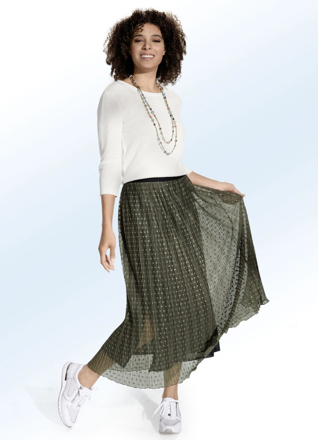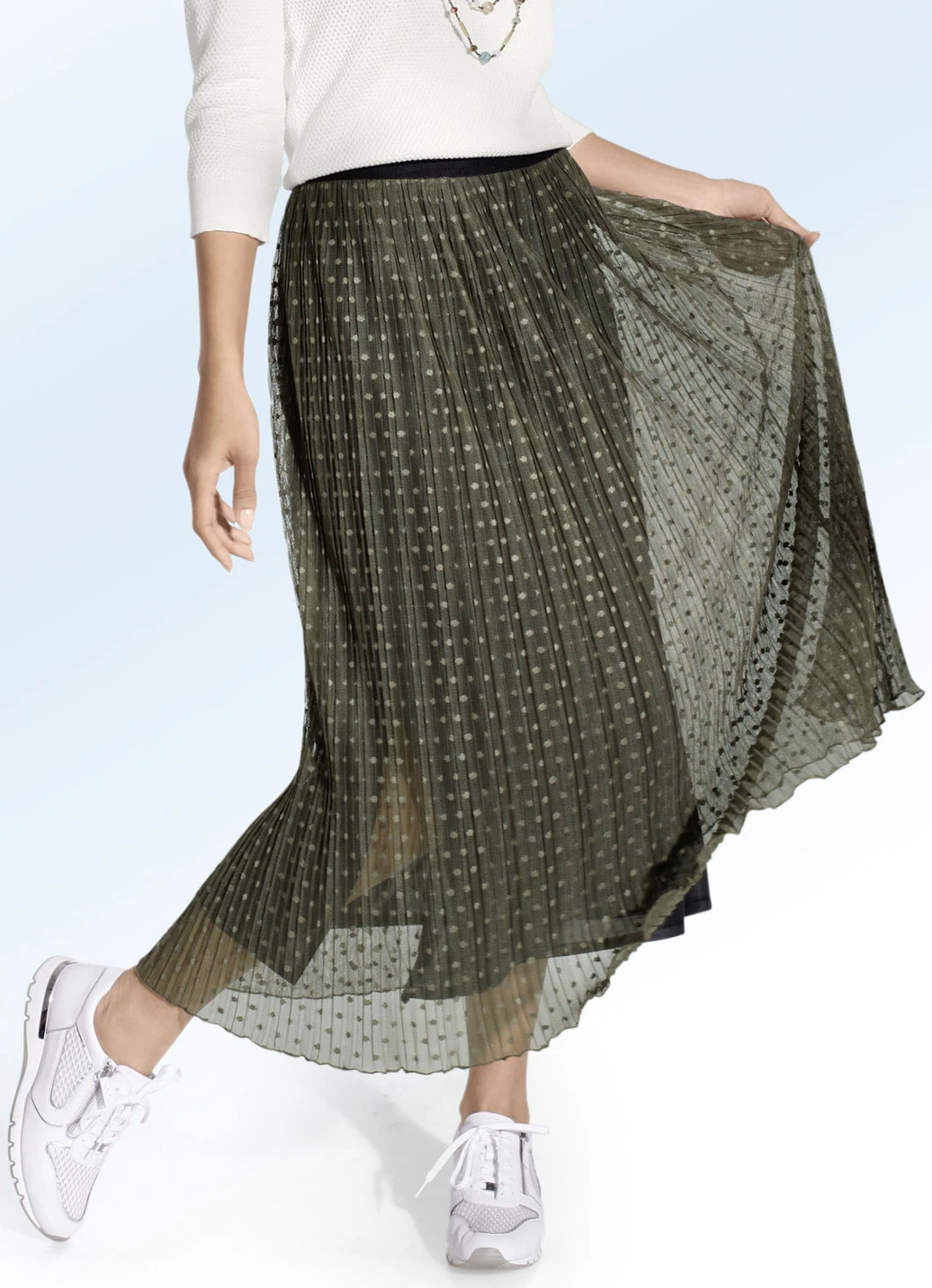 Exzellenter, olivfarbener Plisseerock mit effektvoll eingearbeiteten und farblich angepassten Tupfen: in Schlupfform, mit schwarzem Dehnbund rundum, locker fallende Form sowie blickdicht unterlegt mit elastischem Jerseyfutter. Länge ab Taille ca. 82 cm, bei K-Gr. ca. 76 cm.