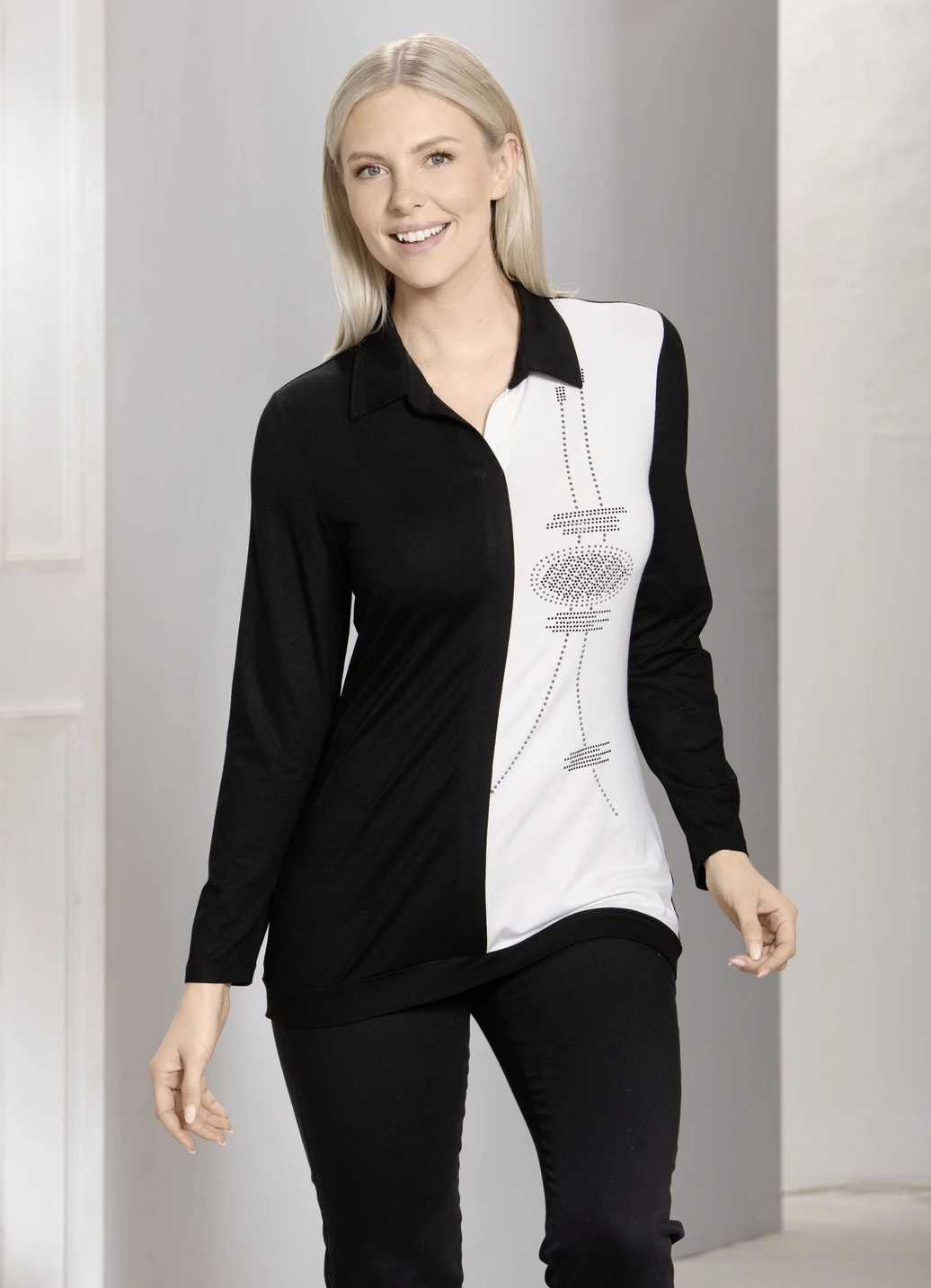 Fabelhaftes Poloshirt mit effektvoller Plättchenzier im schwarz-ecrufarbenem Vorderteil, Rückteil und Ärmel in Schwarz sowie Bund-Abschluss am Saum.