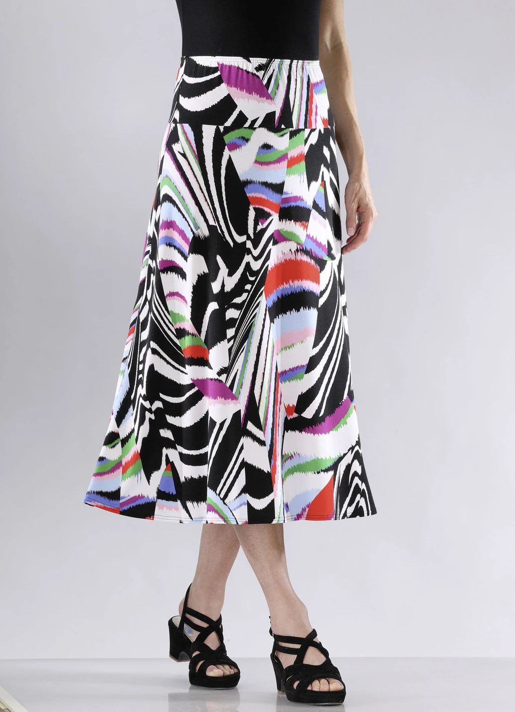 Jedes Teil ein Unikat! Wunderschöner, ausdrucksstark dessinierter Rock im farbbrillanten Inkjet-Druck in Weiß-Schwarz-Rot-Bunt: figurgünstige, breite Passe rundum sowie bequeme Schlupfform mit schmalem Dehnbund rundum. Die leichte Tellerform verleiht diesem Modell seine duftige Weite. Länge ab Taille ca. 78 cm, bei K-Gr. ca. 72 cm.