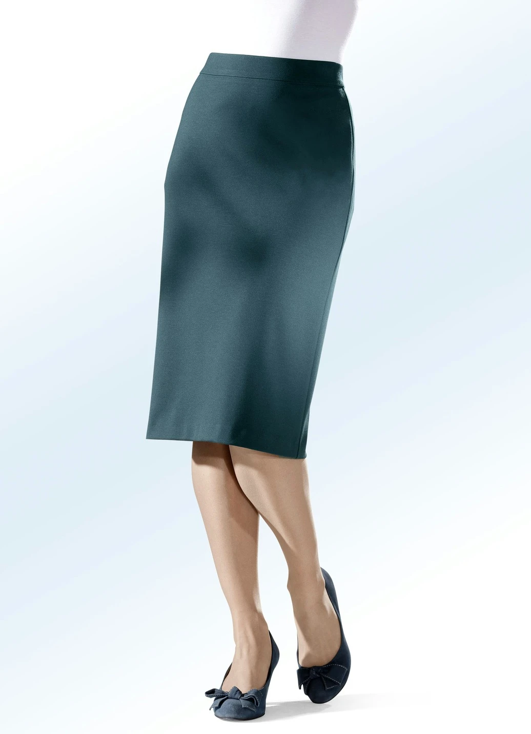 Aparter, kombifreundlicher Rock in gerader Schnittführung: glatt anliegend dank des innenliegenden, unsichtbaren Rundum-Dehnbundes sowie verdeckter Gehschlitz im Rückteil, Länge ab Taille ca. 64 cm, ab Gr. 44 ca. 67 cm, bei K-Gr. ca. 60 cm, ab Gr. 22 ca. 63 cm. Ungefüttert.
