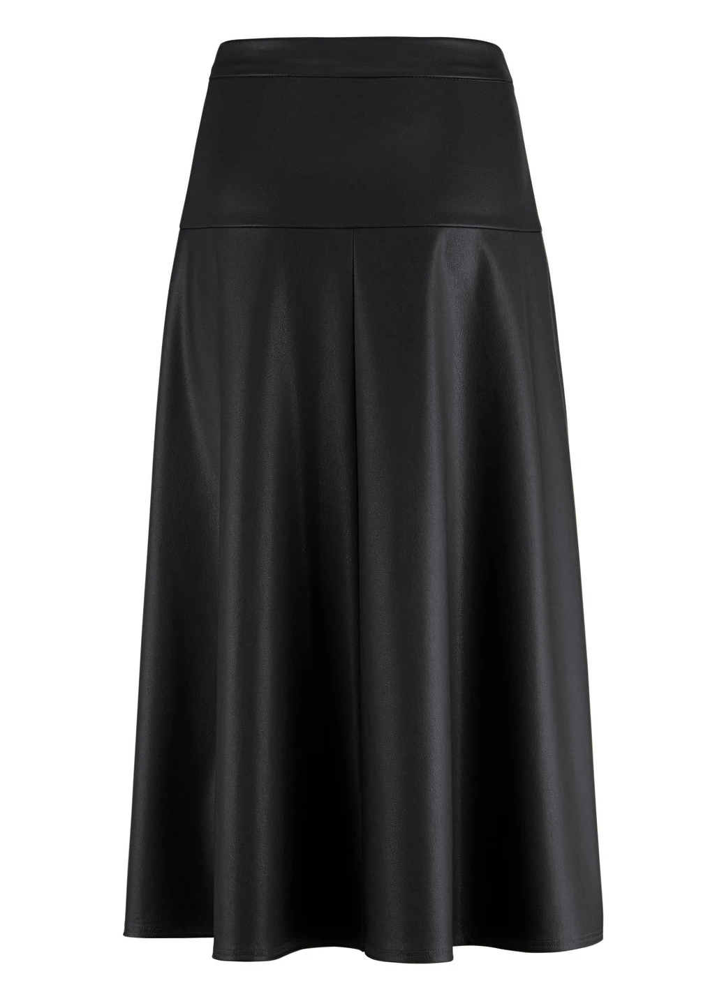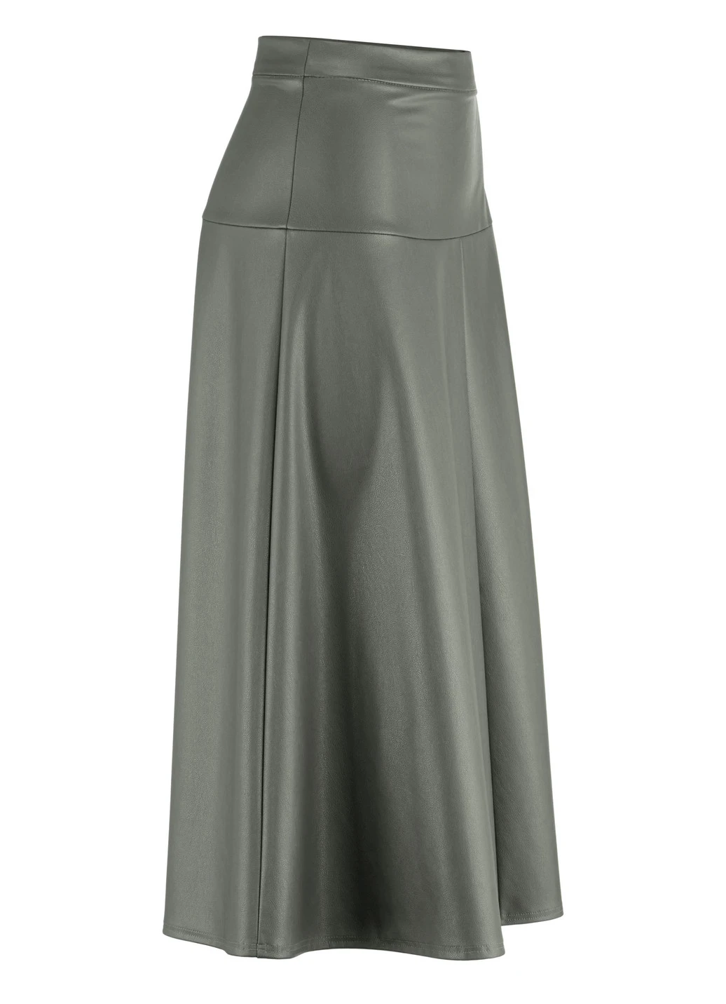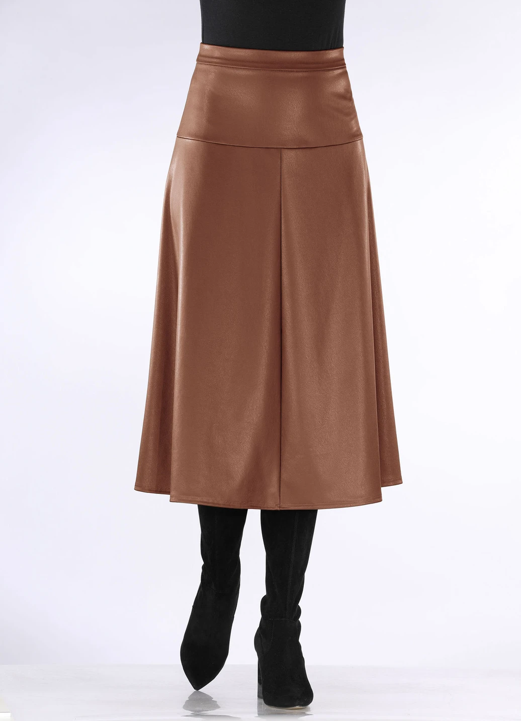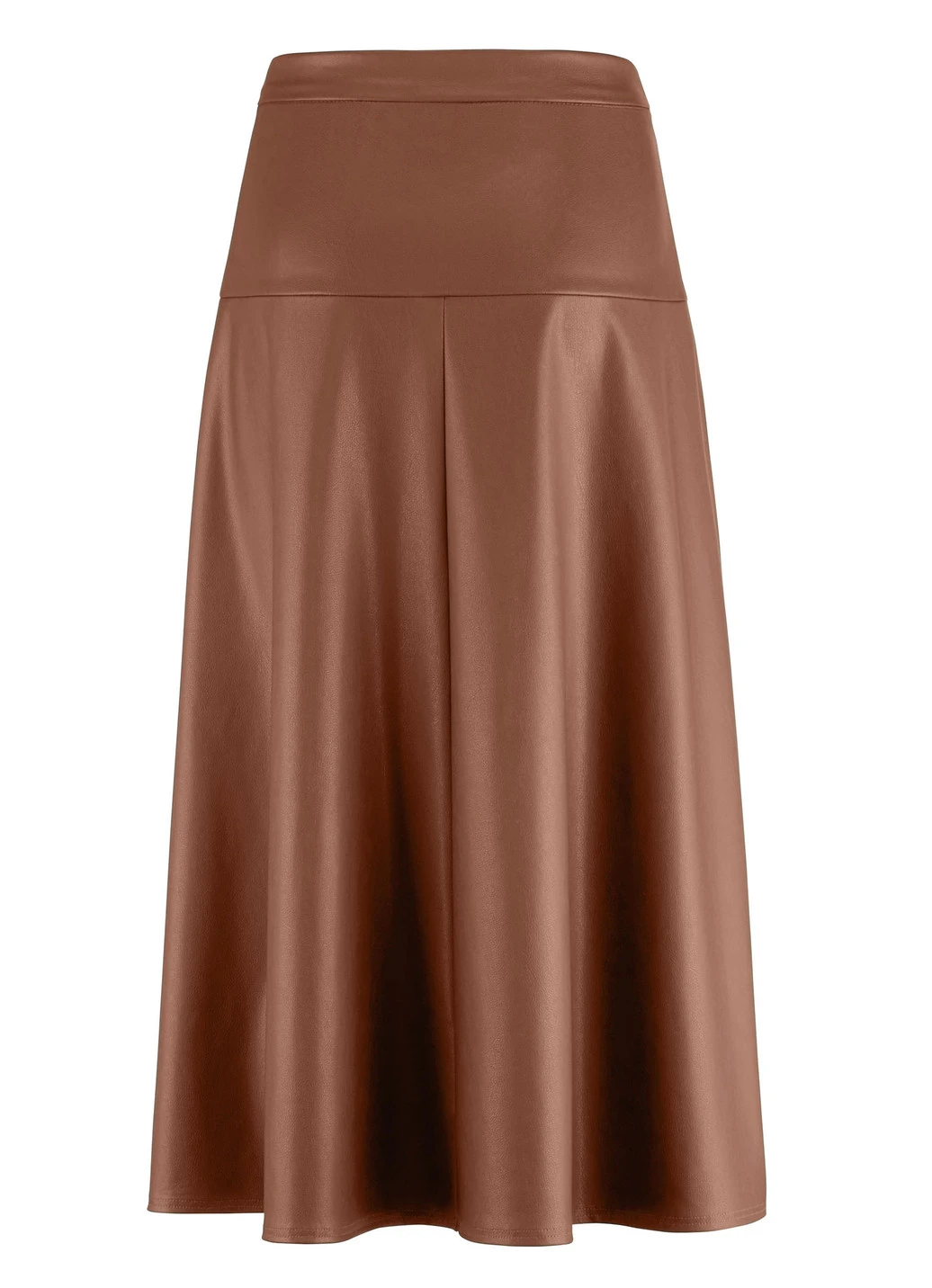 Voll im Trend liegt dieser tragangenehme Rock aus softem Nappaleder-Imitat in bequemer Schlupfform, glatt anliegend dank des innenliegenden, unsichtbaren Rundum-Dehnbundes, figurgünstige, breite Passe rundum sowie Teilungsnähte im Vorder- und Rückteil. Die leichte Tellerform verleiht diesem Modell seine schwingende Weite. Länge ab Taille ca. 78 cm, bei K-Gr. ca. 74 cm.