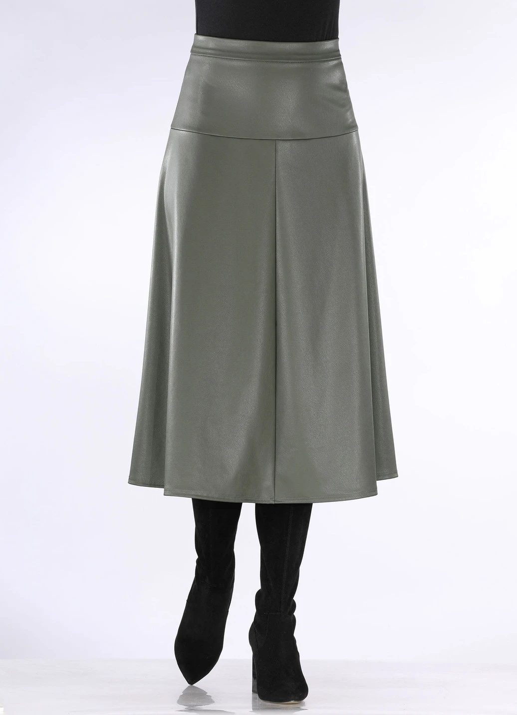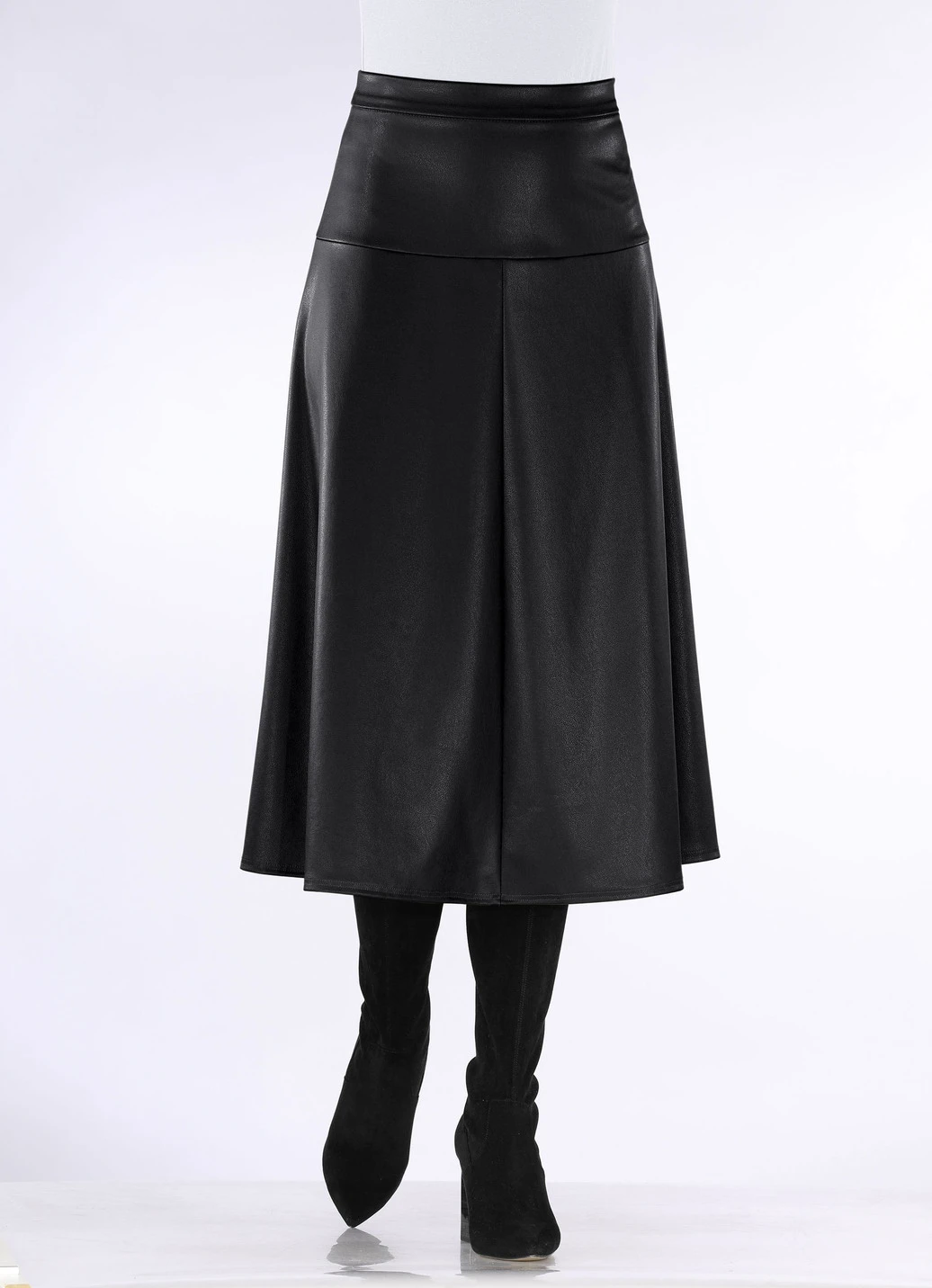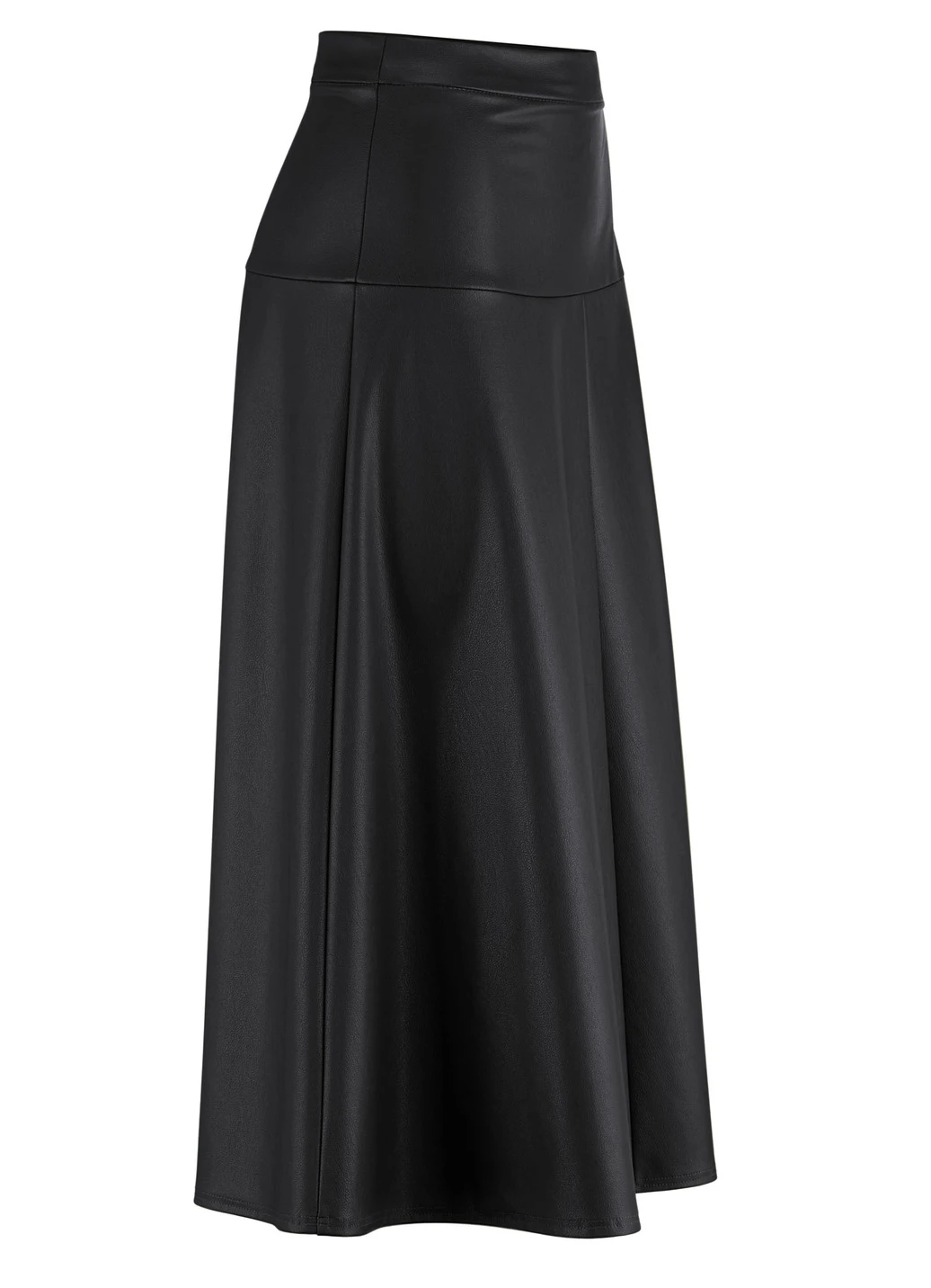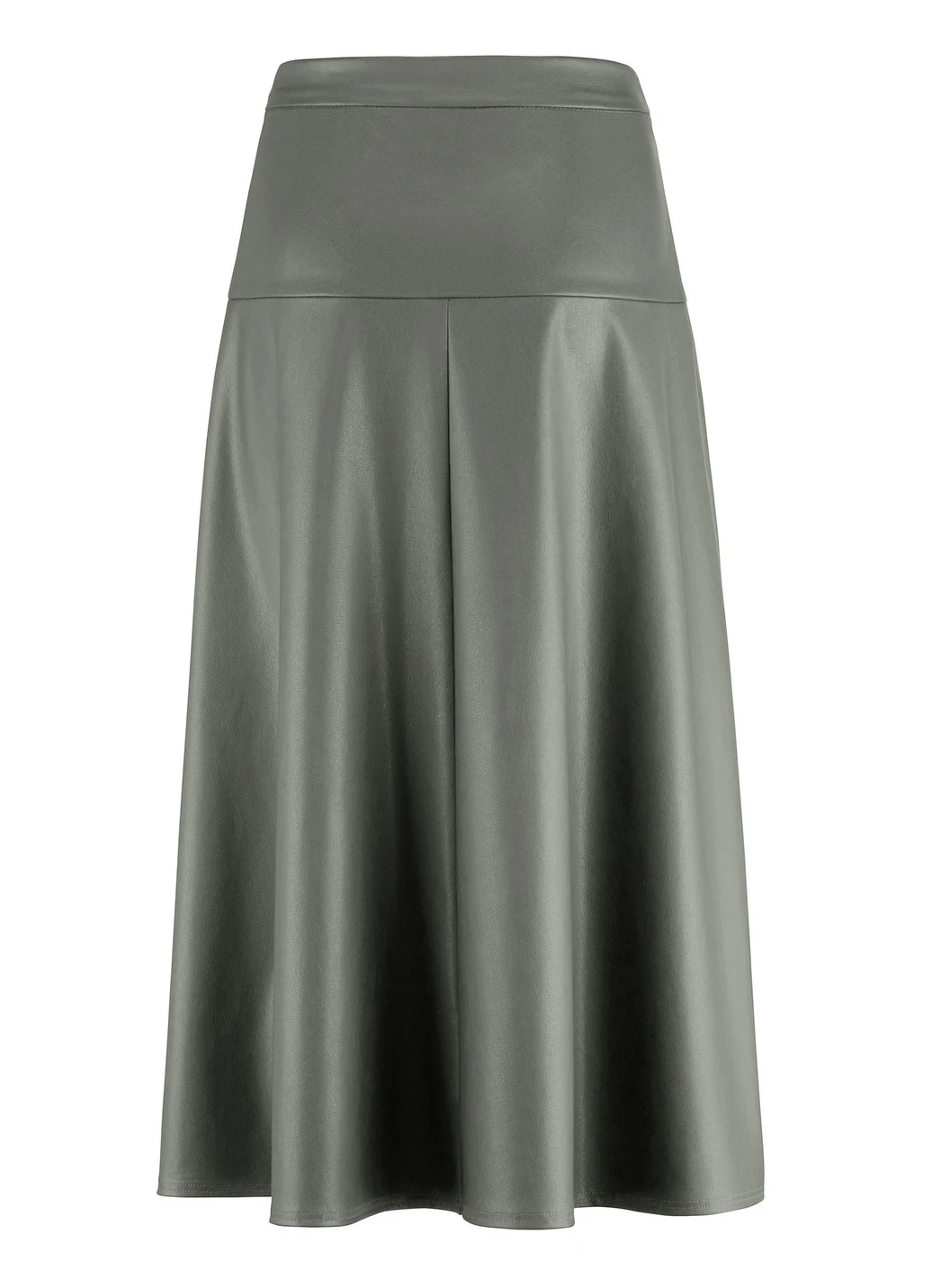 Voll im Trend liegt dieser tragangenehme Rock aus softem Nappaleder-Imitat in bequemer Schlupfform, glatt anliegend dank des innenliegenden, unsichtbaren Rundum-Dehnbundes, figurgünstige, breite Passe rundum sowie Teilungsnähte im Vorder- und Rückteil. Die leichte Tellerform verleiht diesem Modell seine schwingende Weite. Länge ab Taille ca. 78 cm, bei K-Gr. ca. 74 cm.