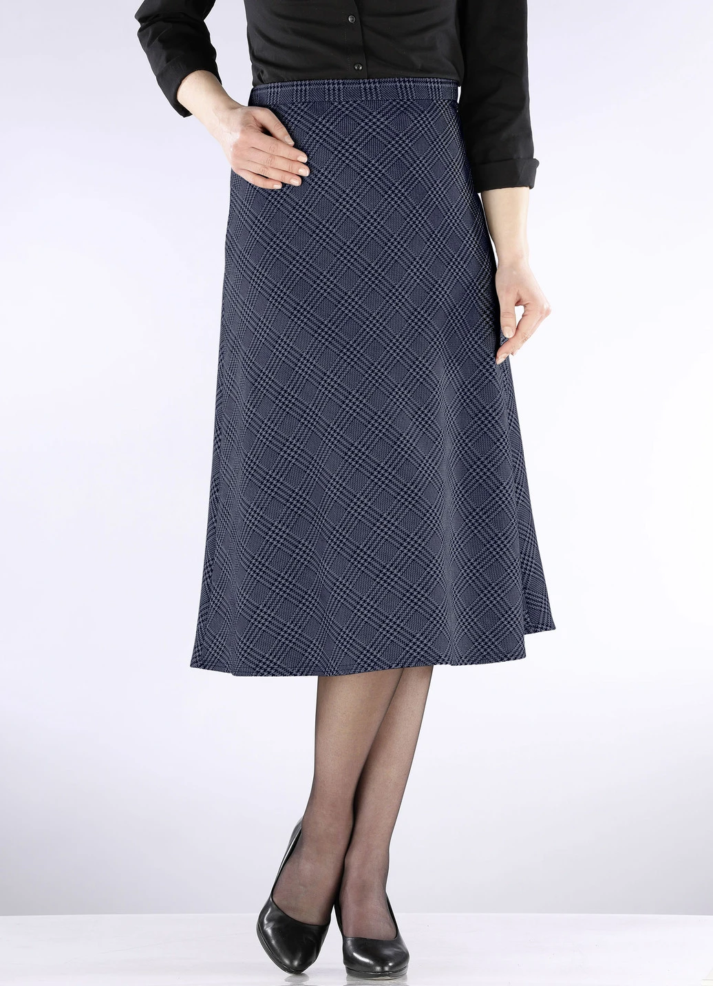 Tragangenehmer, hochelastischer Rock mit aktueller Glencheck-Dessinierung in eleganter, leicht ausgestellter Silhouette, die dem Modell seine leicht schwingende Weite verleiht: in Schlupfform, glatt anliegend dank des innenliegenden, Rundum-Dehnbundes. Länge ab Taille ca. 74 cm, bei K-Gr. ca. 70 cm.