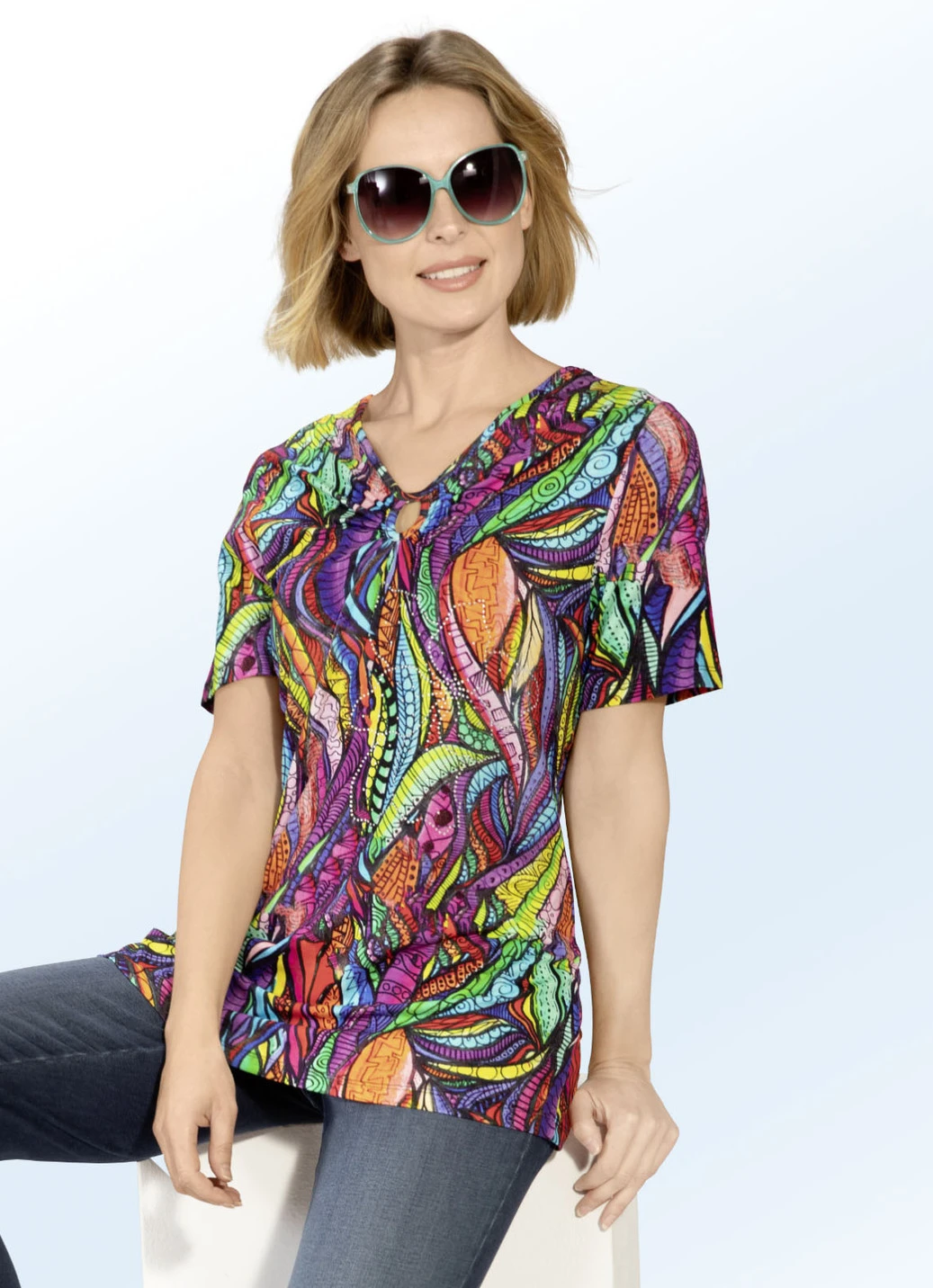 Trendiges Shirt mit farbbrillantem Inkjet-Druck in Multicolor allover, V-Ausschnitt mit raffinierter Raffung sowie Strasszier im Vorderteil.