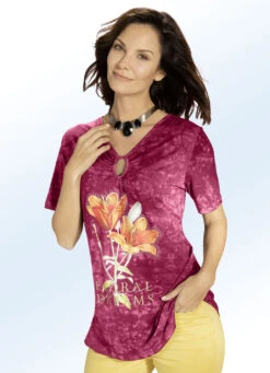 Shirt mit V-Ausschnitt und Fältelung in 2 Farben in Bordeaux-Batik und in Größe 36.