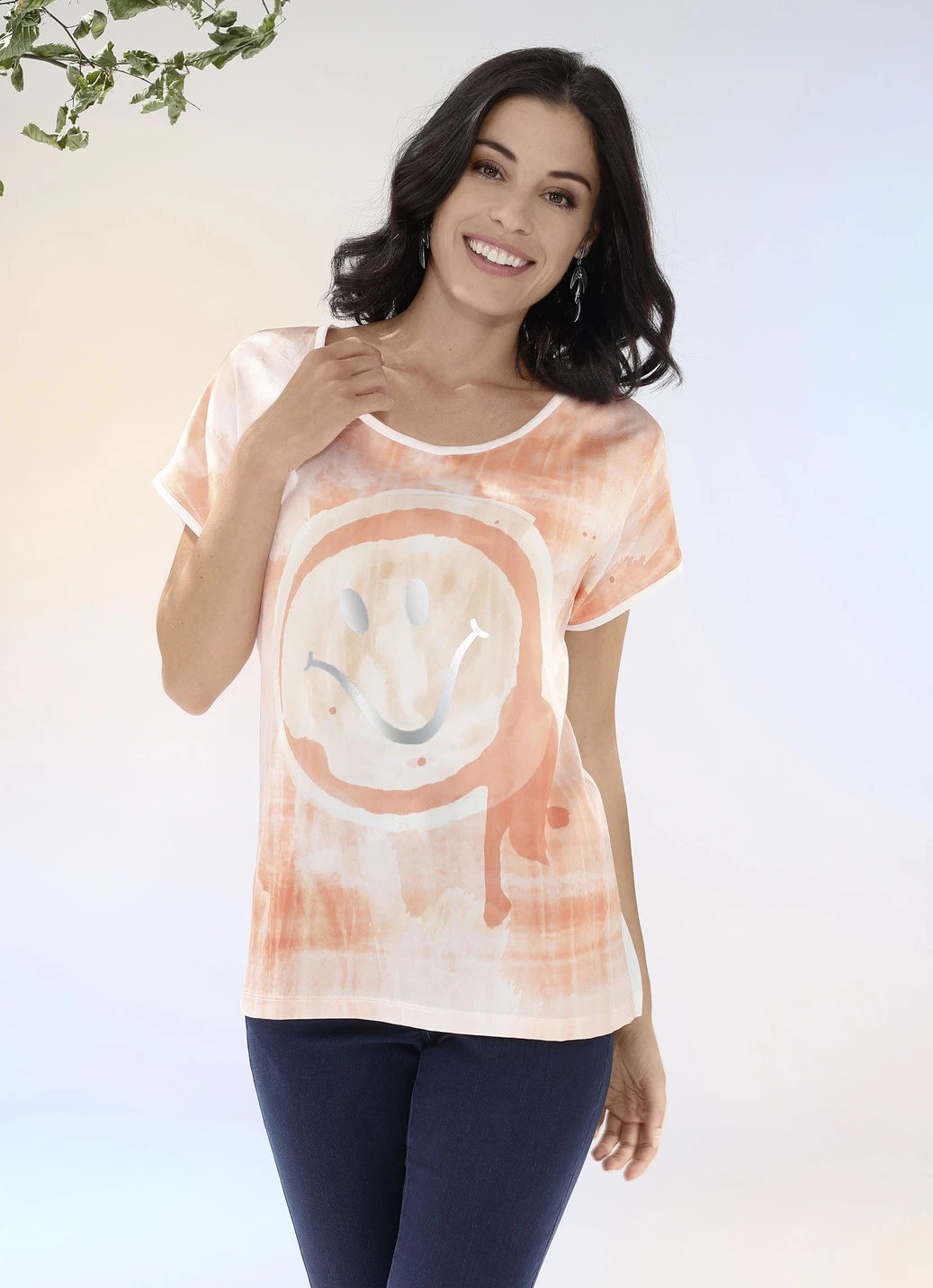 Interessantes Shirt mit witzigem Glanz-Motiv-Druck im orange-ecrufarbenem Vorderteil, Rückteil in Ecru sowie überschnittener Schulterpartie.