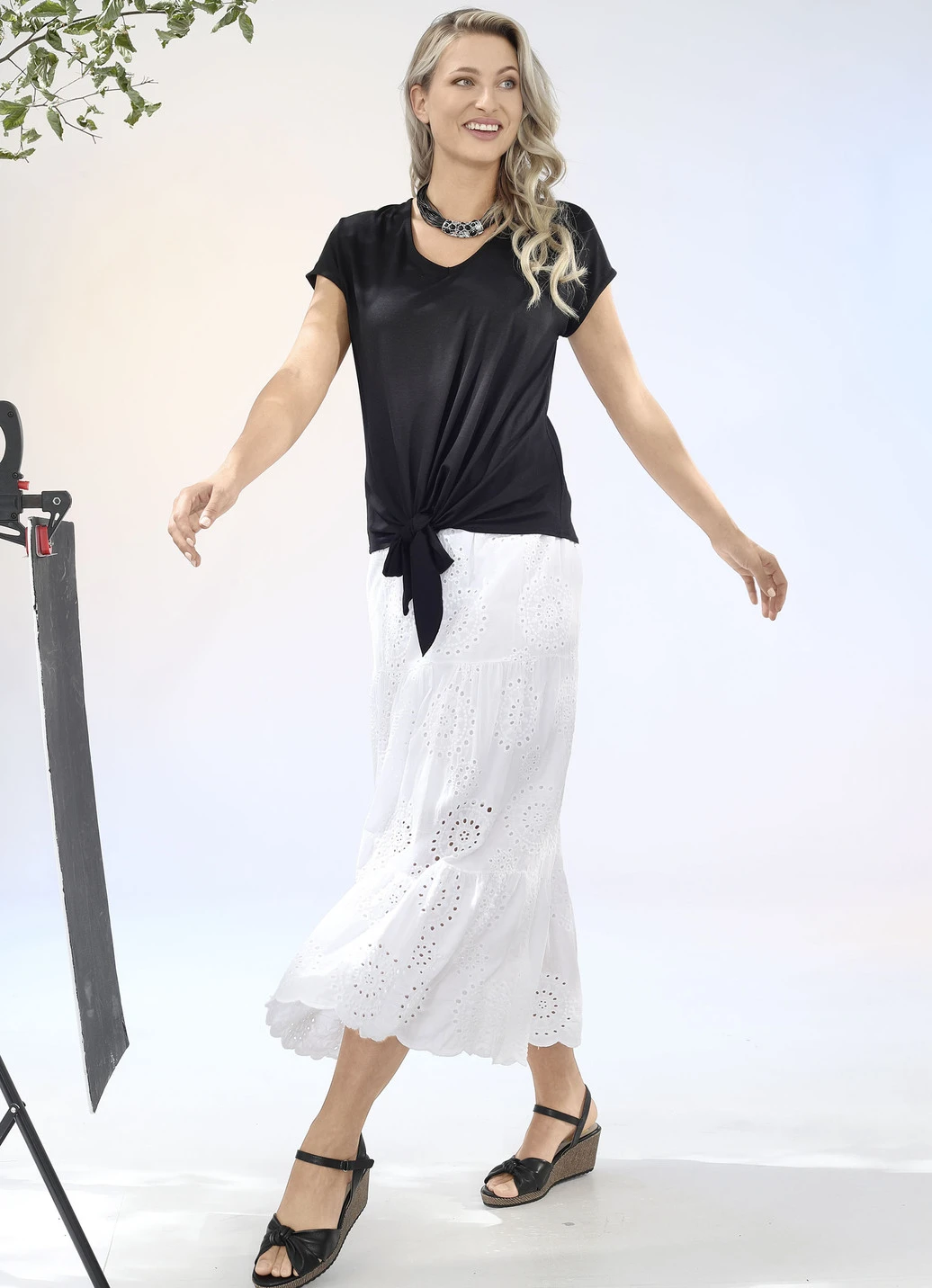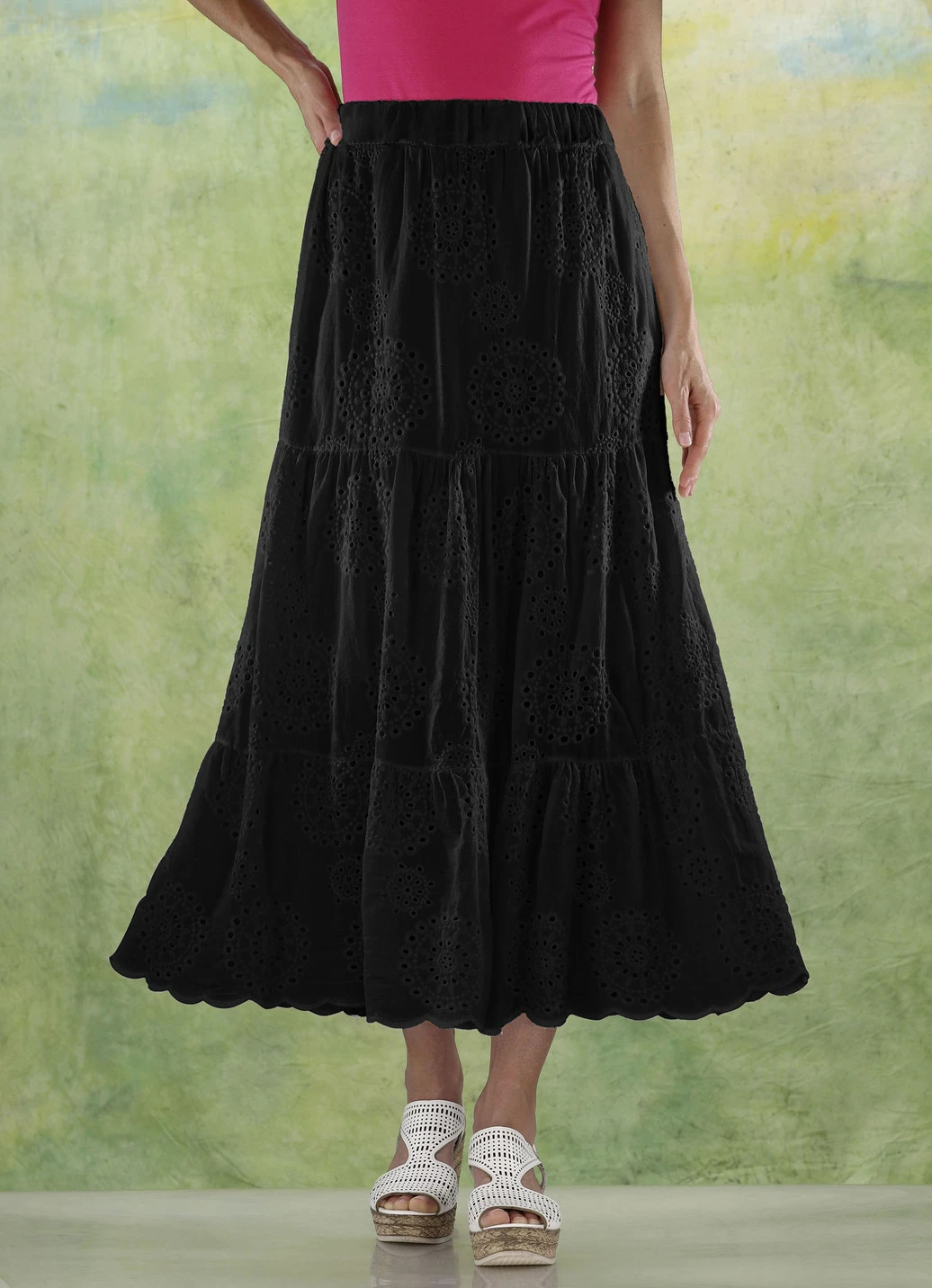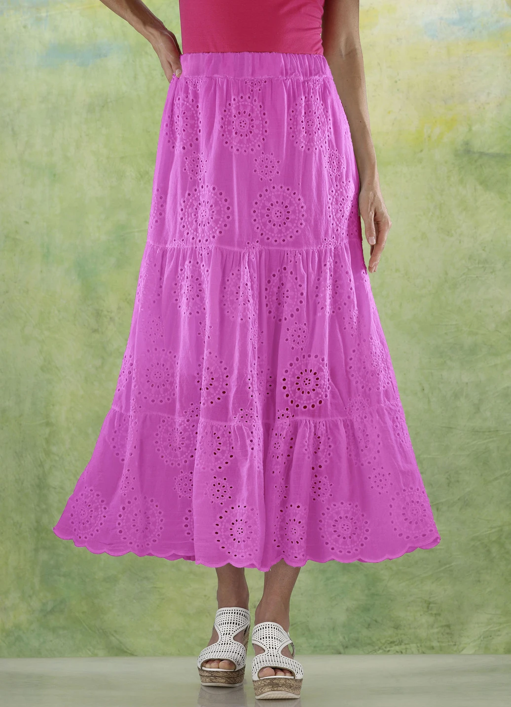 Große Klasse ist dieser sommerlich leichte, tragangenehme Stufenrock mit schöner Lochstickerei in bequemer Schlupfform mit Dehnbund rundum. Länge ab Taille ca. 85 cm, bei K-Gr. ca. 79 cm.