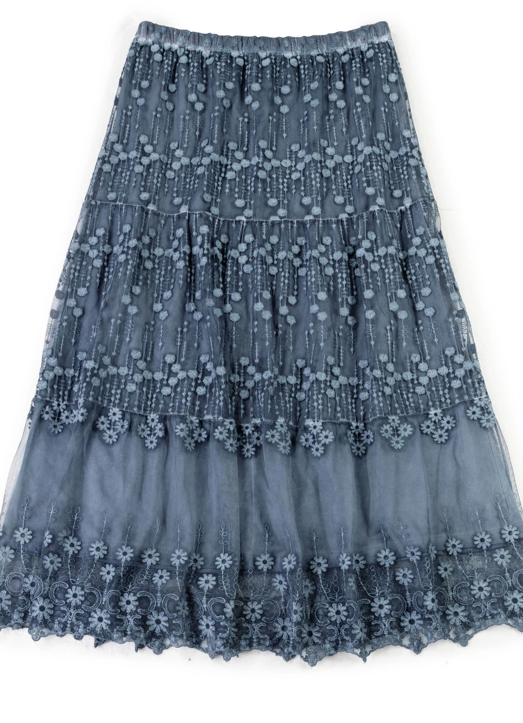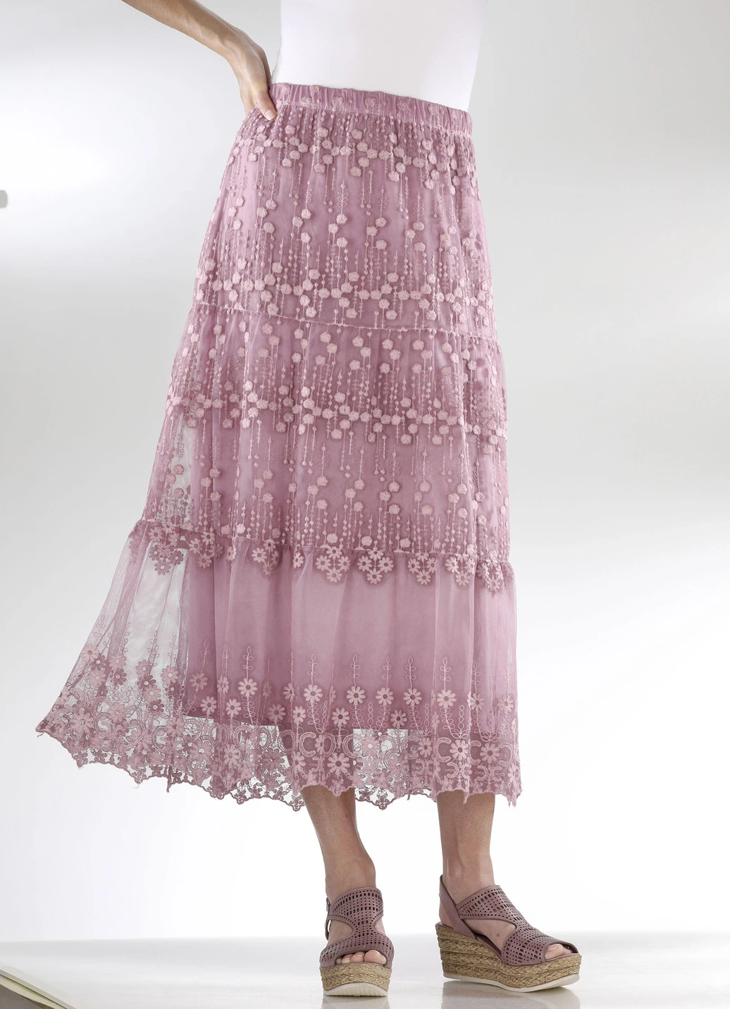 Jedes Teil ein Unikat! Die spezielle Färbetechnik verleiht diesem exzellenten Stufenrock mit aufwendiger Floralstickerei eine besondere Optik: in Schlupfform, Dehnbund rundum. Blickdicht unterlegt aus elastischem, tragangenehmen Feinjersey. Länge ab Taille ca. 85 cm, bei K-Gr. ca. 79 cm. D